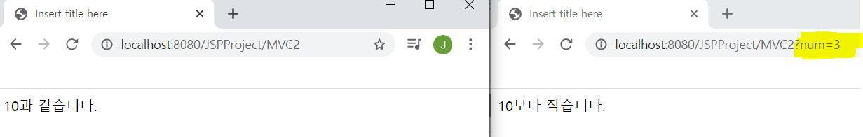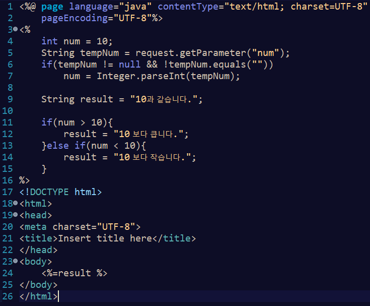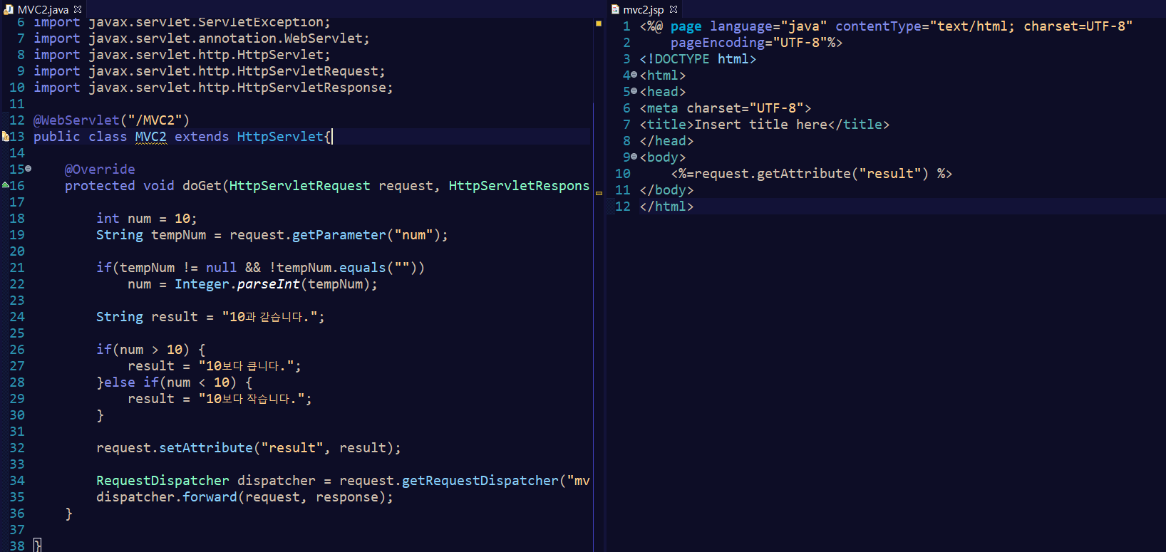 MVC (Model-View-Controller) 는 애플리케이션의 각 요소를 물리적으로 분리함으로써 개발자가 코드의 관리를 더욱 쉽게 할수 있게 해준다. 아래는 MVC1의 예제이다. HTML (View)부분과 Java (Contorller) 부분의 경계가 명확하다는 것을 볼수 있다. 이는 Java코드를 HTML 중간에 껴넣어서 코드가 복잡해지는 불상사를 막을 수 있다. 예제에서는 num이 10보다 크거나 같거나 아니면 같은 지를 리턴해준다.