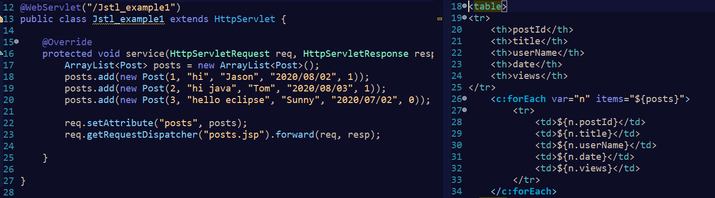 forEach 태그의 사용 예제에 대한 설명을 먼저 하겠다. servlet에서 arraylist를 만들어 post라는 객체를 넣어줄 것이다. 그 다음엔, post.jsp 로 forward 시켜서 arraylilst를 테이블로 구현해보겠다. 원래는 DB를 연동시켜 해보려 했는데 시간상 다음에 하도록 하겠다. 하나 주의 할 것은 Post라는 클래스를 따로 만들어주고 JSP에서 import를 시켜주는 것을 잊어버리지 않도록 하자.