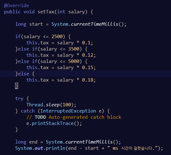 여기서 구현하고자 하는 것은 Developer 클래스의 메소드중 하나인 setTax의 실행시간이다. 실행시간을 구하기위하여 setTax 메소드 안의 시작과 끝에 현재 시간을 구하는 System.currentTimeMillis를 쓰고 차이를 구할 것이다. Thread.sleep은 처리가 너무 짧은 시간에 끝날수 있으므로 쓰여졌다.