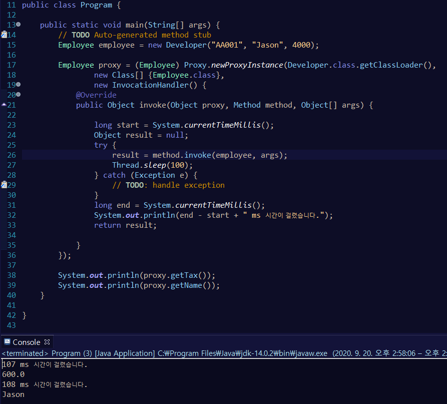 위와같이 getTax, getName을 실행시킴에 따라 proxy를 이용하여 구현했던 기능들이 사용됨을 볼수있다.
