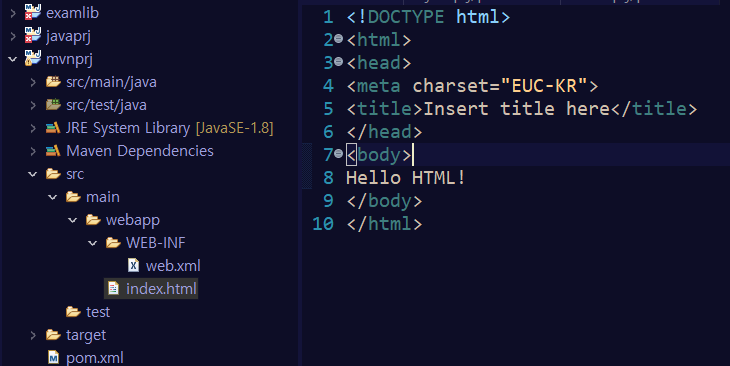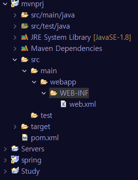 apache tomcat이 깔린 곳으로 들어가 webapps -> ROOT -> WEB-INF 로가면 web.xml 파일이 있는데 이것을 복사해서 WEB-INF 안에다가 넣어주면 된다. 그러면 보다시피 pom.xml 파일에 떠있던 x표시가 없어짐을 볼수있다.