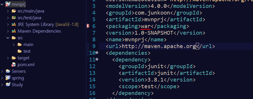첫번째로 해야 되는 것은, pom.xml 파일에 있는 packaging을 war로 바꾸어주어야한다.
